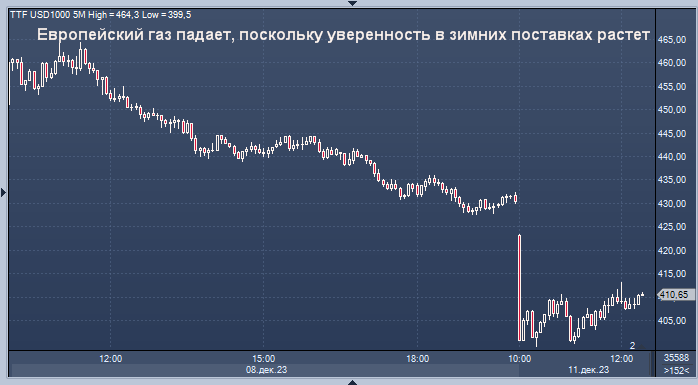 Контракты с поставкой в январе теперь дешевле апрельских. График цены ближайшего фьючерса на спотовый индекс газа TTF на бирже ICE Futures (в долларах США за тысячу кубометров) интервалами в 5 минут Трейдеры все больше уверены в том, что европейский газовый рынок спокойно переживет холодный сезон, а зимние контракты будут дешевле, чем летние. Эталонные фьючерсы январской поставки упали на 6,7% в понедельник и торговались ниже аналогичного апрельского контракта. Именно тогда обычно заканчивается отопительный сезон и спрос на газ снижается. В Европе наблюдался вялый спрос на топливо, несмотря на недавнее похолодание, в результате чего запасы стали более полными, чем обычно, и ослабили опасения по поводу поставок энергоносителей в этом сезоне. Следующей задачей региона станет заполнение хранилищ летом для подготовки к следующей зиме. На данный момент на континент возвращаются более умеренные температуры, снижая спрос на отопление. По словам метеоагентства Maxar, на этой неделе в некоторы