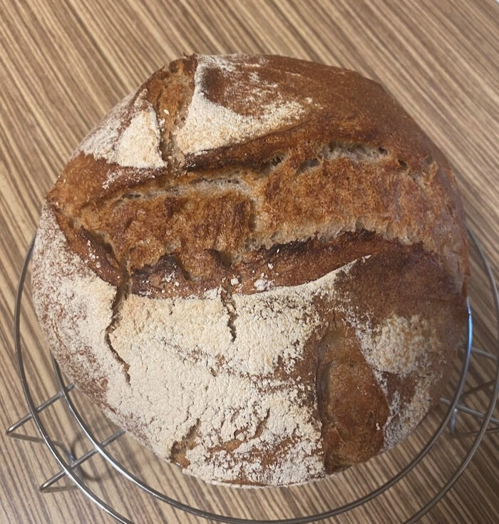 Содержание ржаной муки 40%. Я пеку этот хлеб на ржаной закваске. (рецепт спонтанной ржаной закваски можно посмотреть здесь) Опара. 10Гр закваски. 60 Гр ржаной обдирной муки. 60Гр воды. Тесто. Вся опара. 90Гр ржаной обдирной муки. 210 Гр пшеничной муки 1 сорта (или высшего) 190 Гр воды. 6 Гр соли. Замесить тесто в планетарном миксере или вручную. Переложить в емкость смазанную оливковым маслом. Брожение 2 часа. Расстойка Сформовать шар и выложить в расстоечную корзину щедро посыпанную мукой швом вниз. Накрыть пленкой, или влажным полотенцем, чтобы тесто не заветривалось. Оставить для расстойки на 2 часа. Выпечка Перед выпечкой хлеб обрызгать водой из пульверизатора. Выпекать в заранее разогретой духовке на пекарском камне при температуре 250С накрытым куполом 15 минут. Потом еще 20 минут при температуре 220С. Готовый хлеб остудить на решетке под полотенцем. Инвентарь который использовался, и чем его можно заменить. Для взвешивания ингредиентов – весы кухонные – ничем, в стаканах, щепотк