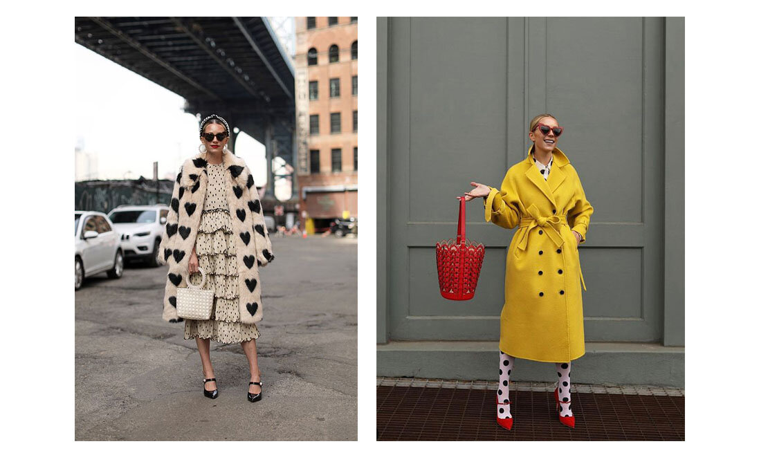 Лук справа кричит своим желтым цветом: «Обратите на меня внимание». Но сколько людей способны выдержать такой яркий жёлтый и дополнить его акцентом правильного красного и принта в горошек? В итоге это притягивает, даже если вам не нравится жёлтый. Или горошек.