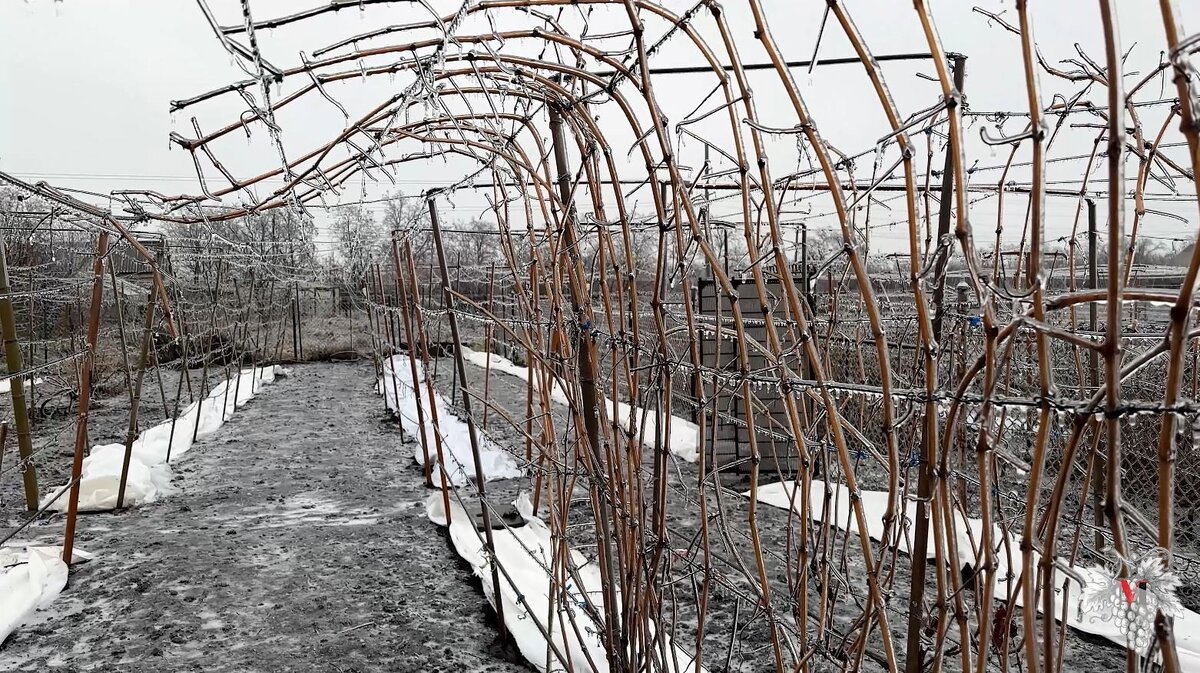 В данном выпуске я расскажу Вам о том, как зимует мой виноградник. А именно, я покажу Вам, как обледенел мой виноград в результате экстремальных погодных условий. Плюс ко всему в этом выпуске Вы узнаете о возможных последствиях, которые могут наступить для винограда после такого сильного обледенения. Уже пошли третьи сутки у меня на приусадебном участке с того момента, как началось обледенение. Такого сильного и длительного обледенения давно не было, и если честно, то я уже и не помню, когда вообще такое было. Выше и ниже на фотографиях Вы можете видеть, насколько сильно обледенел мой сад и не укрытый виноград. На этих фотографиях Вы можете видеть виноград «Кишмиш Юпитер», а также плодовые деревья (абрикос, персик, яблоня, груша и так далее). Виноград «Кишмиш Юпитер» очень выносливый и морозоустойчивый технический сорт, поэтому я его никогда не укрываю и никогда за него не переживаю. Если брать конкретно этот сорт, то он уже попадал под обледенение на срок около 48 часов и почка никог