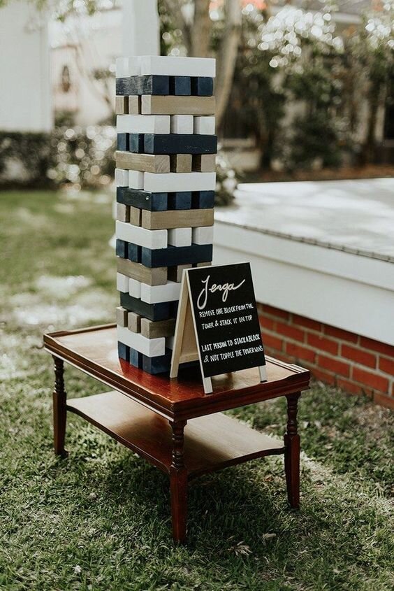 Кто не любит эту классическую игру? Сделайте ее незабываемой, попросив гостей подписать плитки своими именами и пожеланиями. Таким образом, когда бы вы с партнером ни играли в "Дженгу", вы всегда будете вспоминать своих друзей и веселые моменты свадьбы. Усовершенствуйте игру (и сделайте ее подходящей для вечеринки на открытом воздухе) с помощью гигантской "Дженги"!