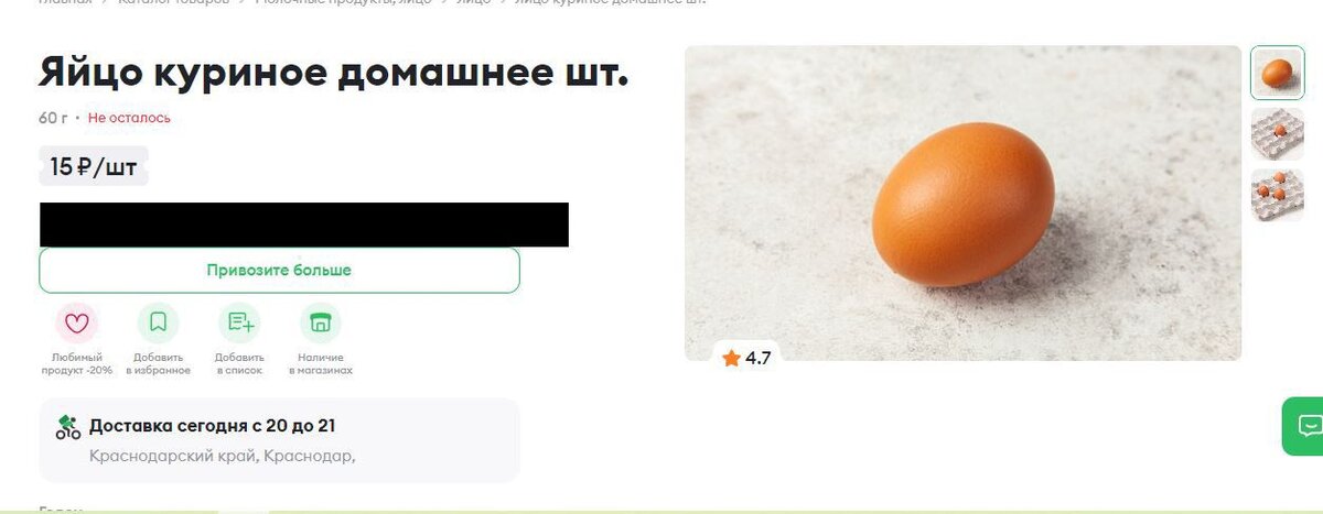 Краснодарцы 11 декабря обратили внимание, что в некоторых сетевых магазинах и на других торговых площадках местным жителям предлагают купить куриные яйца поштучно. - Я нередко закупаюсь в известной сети, где реализуют продукты для здорового питания. Мне необходимо было взять десяток яиц для приготовления завтрака. В каталоге я обратила внимание на следующую позицию «яйцо куриное домашнее штука». В описании говорится, что привезут столько, сколько нужно – «лучший вариант, если сегодня вам нужна только пара-тройка яиц к завтраку или, наоборот, целая дюжина, чтобы нарубить сразу тазик оливье». Это, видимо, из-за ажиотажа на них и завышенных цен на десяток. 15 рублей за одно яйцо Судя по отзывам, яйца были в продаже еще летом этого года. - 5 баллов за концепцию. Мне всегда не хватает пару яиц для готовки, а так не надо заказывать десяток, - написал местный житель в августе. Однако сейчас на сайте магазина указано, что яйца закончились. В связи с чем – неизвестно. Ценный пищевой продукт пош