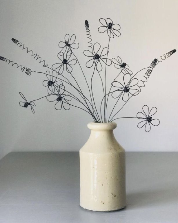 Это довольно бюджетные материалы, и у многих они найдутся в наличии или в ближайшем магазине хозтоваров. 1. Начните скручивать центральную часть соцветия с центральной спирали 2. Далее скручивайте каждый лепесток чуть ниже спирали 3. Отрежьте проволоку на желаемой длине у стебля 4. Поставьте один или несколько цветочков в небольшую вазочку и по желанию можете дополнить другими видами Этот вид поделок также