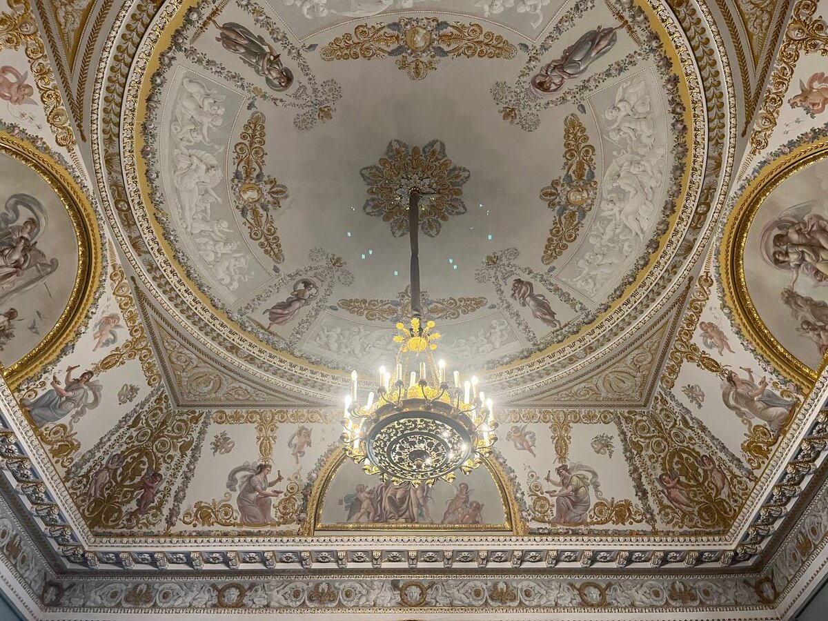 Кстати, по моему личному восприятию, РМ куда уютнее и круче Эрмитажа по экспозиции картин (не по интерьерам конечно, что уж там). Правда, в этому году обнаружила, что все перевесили в постоянной экспозиции, ряды картин Васнецова поредели... Куинджи "переехал". Но все равно, приходя туда, душа радуется. А с потолками то что? Вот и до них дошли :) Ну так вот, да, и в РМ, и в Эрмитаже (там то уж вообще вне сомнений) сами интерьеры дворцов и потолки - это уже целое произведение искусства. Роспись, лепнина, позолота - они захва