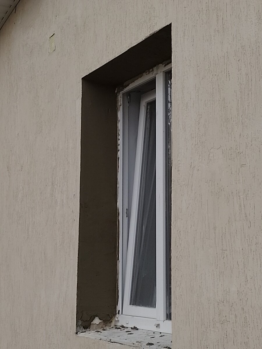 Здравствуйте! Продолжаем работы в Крымской глубинке, напомню, глубинка не потому что все плохо, а даже и наоборот. Тихое, спокойное село, подальше от туристов и связанной с этим суеты. Зато большая, отремонтированная школа, на улице, где работаю новый асфальт. Уютно в общем и тихо, по южному не торопливо. Что бы оставшиеся заштукатуренными места подсохли, надо все доделать, до штукатурить. В прошлый раз откосы штукатурил, и что бы не марать не портить, не стал ставить новые отливы, старые с увеличением толщины стены, уже не подходят, нужны шире, вот их и буду ставить. Что странно, когда заказывали профлист на подшивку карнизов, спросили, из какого металла делать, взяли потолще. А вот все гнутье по видимому по умолчанию, из самого тонкого металла. Это я еще на лобовых заметил. Но они не такие широкие как оконные отливы, поэтому не критично. А на отливах печально. Снял старый отлив. Он прикручен к подставочному профилю, в Сибири этот самый профиль всегда убираем, иначе будет