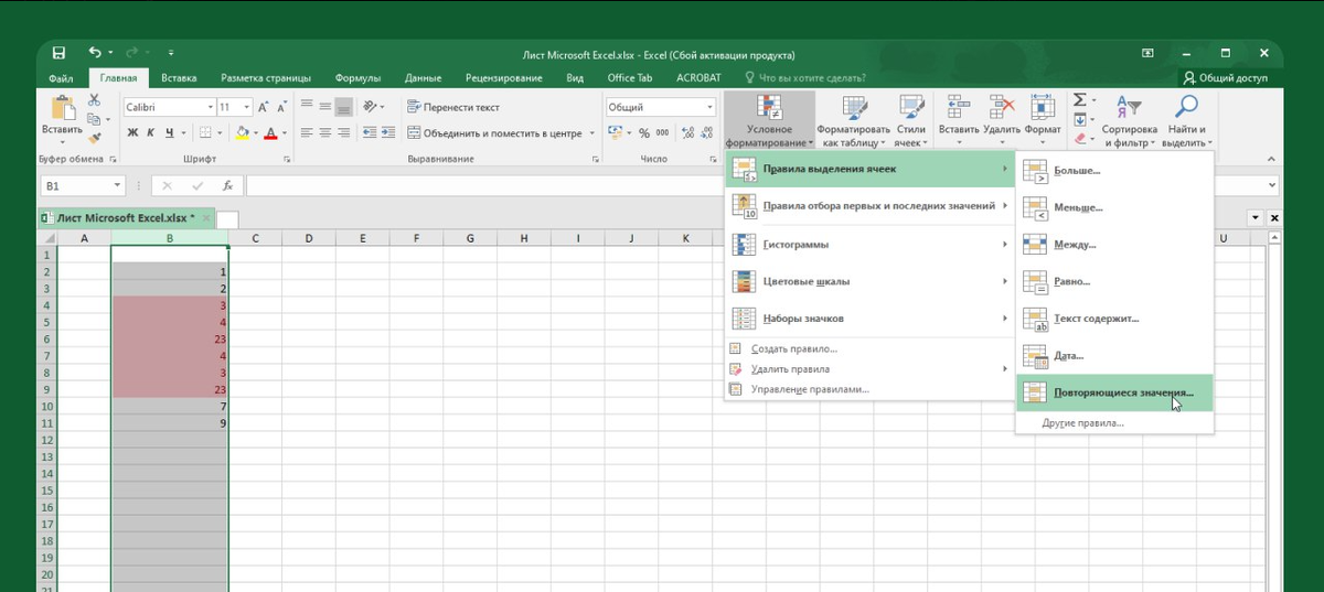 2. На вкладке «Главная» выберите «Условное форматирование» → «Правило выделения ячеек» → «Повторяющиеся значения» → «ОК».