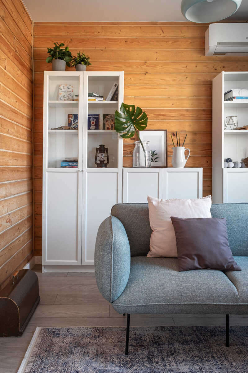 У дизайнера Константина Колесова не было задачи выдержать какой-то определенный стиль. Хотелось просто создать теплое, уютное пространство с различными зонами, где будет приятно находиться и проводить время. Базовая концепция объекта во многом продиктована архитектурой и материалом стен дома. Данный интерьер я разрабатывал сам для себя, импровизируя по ходу ведения строительных работ. Пространство постепенно наполнялось множеством разнообразных элементов, каждый из которых имеет свою уникальную историю появления, хранит в себе воспоминания и радует глаз. Таким образом в интерьере присутствуют как минималистичные предметы мебели в скандинавском стиле, так и винтажные, самостоятельно отреставрированные объекты. Стены частично выкрашены в светлые спокойные тона, сохранен натуральный цвет и оттенок сосны. Потолки выполнены в классическом матовом белом цвете в контраст рельефным стенам. Использование акцентных элементов мебели насыщенных цветов — достаточно простой и актуальный прием, позв