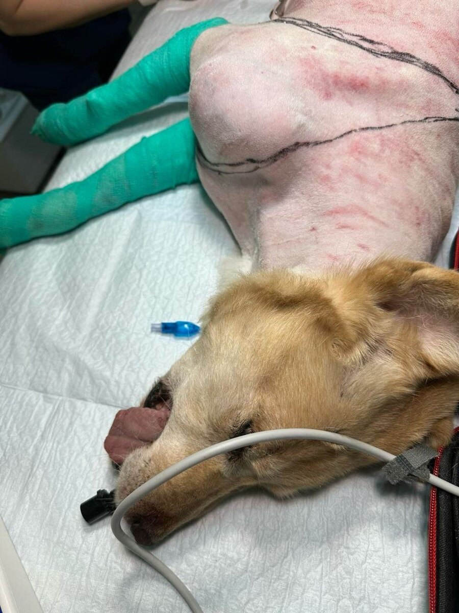 Это Жёлтенький.🐶 Он в стационаре в Самаре. Ему ампутировали лапу, потому что она была раздутая – подозрение на саркому кости.(