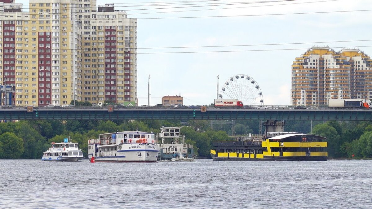 Канал имени Москвы – очень оживленная водная артерия. Особенно это заметно в выходные дни. В этом кадре мы видим сразу четыре речных судна, один из которых — буксир. Более того, в кадр попали еще две частные лодки! Кстати, два из четырех крупных кораблей в кадре — бывшие сухогрузы, а теперь прогулочные пассажирские суда.