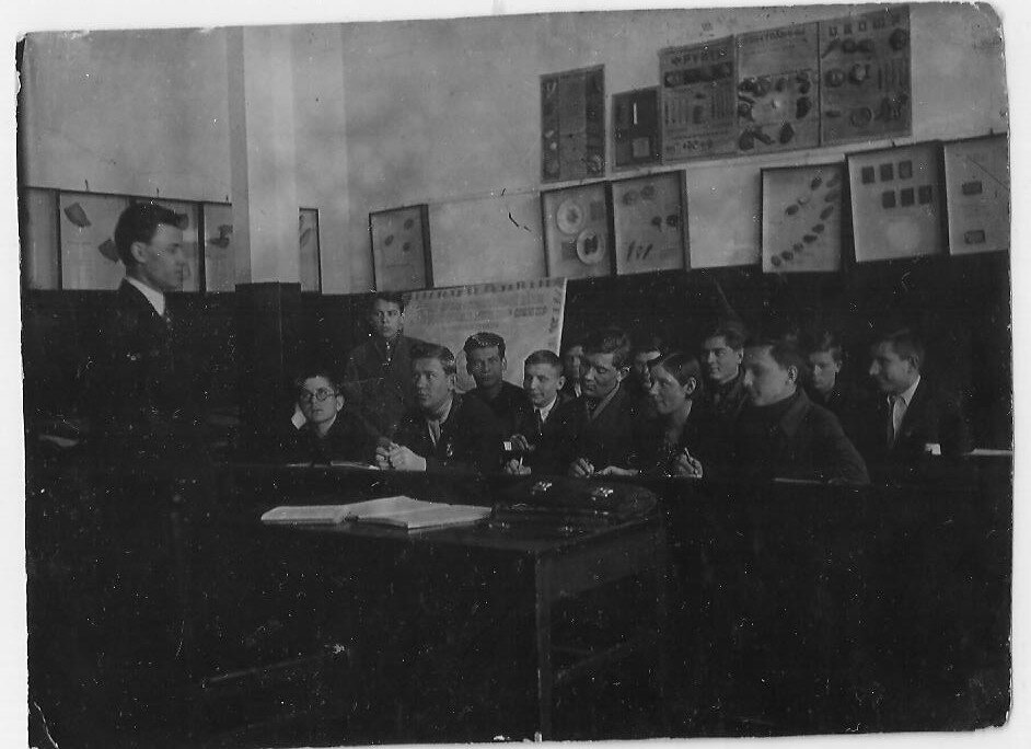 1938 год. Во время учёбы в техникуме. Все сидят, он стоит около стены со стендами. Может отвечает задание?