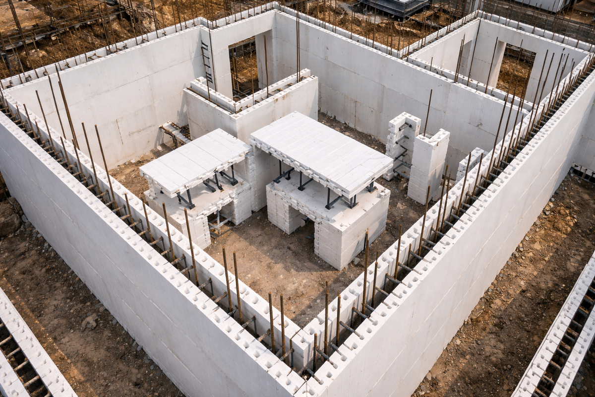 Оптимальным основанием для несъёмной опалубки является ленточный фундамент. Как и в любом другом строительном процессе, между фундаментом и первым рядом прокладывают слой гидроизоляции, для чего в профилированную мембрану или ПВХ-плёнку вбивают прутья арматуры. При этом не рекомендуется использовать пластичные мастики на основе битума — вместо них лучше использовать полиэтилен или толь с асфальтовой посыпкой, а в ряде случаев можно и вовсе обойтись без гидроизоляции.
