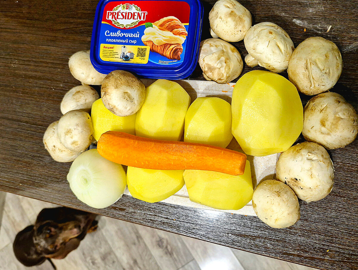 Один из самых любимых супов нашей семьи. Вкусный, лёгкий и не надоедает))) Понадобится : И конечно же, такса в помощь 😁 Наливаем в кастрюлю воды, кладём в неё куриную спинку, лавровый лист, стебли укропа и целую луковицу. Доводим до кипения, снимаем пену, убавляем температуру почти до минимума, накрываем крышкой и варим около часа. Через час из готового бульона достаём всё и кладём туда куриное филе, варим до готовности. Лук нарезаем мелким кубком, морковь трём на крупной тёрке. Можно сделать зажарку, но я не люблю, бросаю в бульон сырыми. Грибы и картофель нарезаем произвольным кубком, так же кидаем в бульон, варим до полуготовности картошки. Добавляем соль и специи по вкусу. Добавляем сыр, размешиваем до растворения. Всыпаем кукурузу и на самой низкой температуре варим до готовности картошки. В готовый суп бросаем зелень. Готово, наслаждаемся 😊 Пробуйте, вам обязательно понравится 🥰