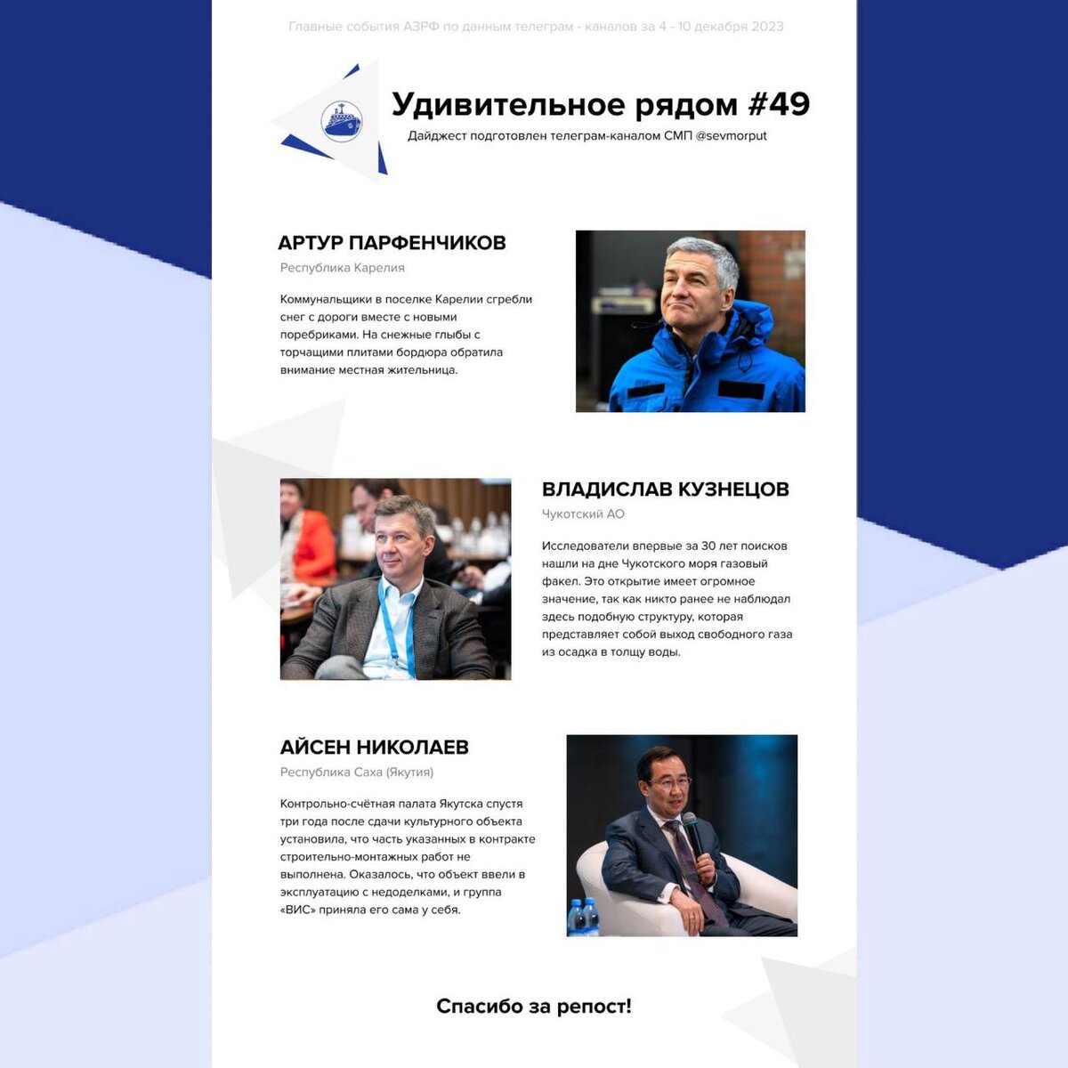 Представляем еженедельный рейтинг «Главы АЗРФ — Удивительное рядом. Неделя 49» Артур Парфенчиков «Чистая работа» Коммунальщики в поселке Карелии сгребли снег с дороги вместе с новыми поребриками. Торчащие из огромной горы снега плиты бордюра, который совсем недавно впервые появился вблизи здания начальной школы, заметила местная жительница. Именно она обратила на это внимание, и дала делу огласку. Владислав Кузнецов «Историческая находка» В рамках арктической экспедиции сотрудниками Тихоокеанского океанологического института на исследовательском судне было сделано открытие в Чукотском море. Впервые за последние 30 лет исследований был обнаружен газовый факел на дне моря. Эта структура представляет собой выход свободного газа из осадка в толщу воды. Открытие имеет огромное значение, так как никто ранее не наблюдал здесь подобную структуру. Айсен Николаев «Сами себе хозяева» Центр культуры и современного искусства им. Ю.А.Гагарина, построенный для Якутска ООО «Газэнергомонтаж» (входи