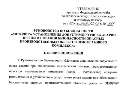 Обновленное Руководство по безопасности «Методика установления допустимого риска аварии при обосновании безопасности опасных производственных объектов нефтегазового комплекса» содержит рекомендации к установлению допустимого риска аварии при обосновании безопасности ОПО и разработано в целях содействия соблюдению требований следующих Федеральных норм и правил в области промышленной безопасности: «Общие требования к обоснованию безопасности опасного производственного объекта»; «Общие правила взрывобезопасности для взрывопожароопасных химических, нефтехимических и нефтеперерабатывающих производств»; «Правила безопасности в нефтяной и газовой промышленности»; «Правила безопасности для опасных производственных объектов магистральных трубопроводов»; «Правила проведения экспертизы промышленной безопасности».