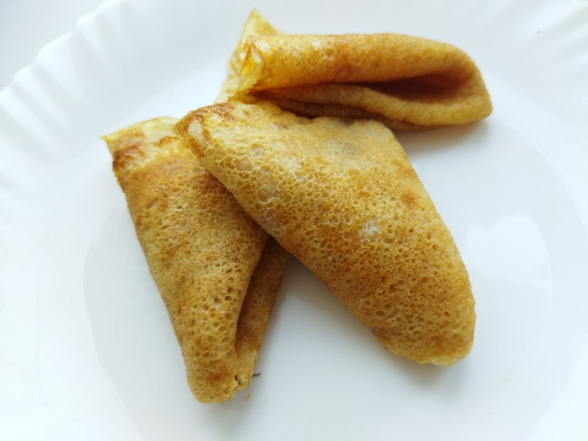 Для теста Мука – 1,5-2 стакана Куркума – ½ ч. ложки Соль – ¼ ч. ложки Сахар – 1 ч. ложку Сода – 1 ч. ложка Лимонная кислота – 1/3 ч. ложки Вода горячая – 600 мл (40-45 градусов) Масло растительное– 1-2 ст. ложки Для начинки Сахар – 0,5 стакана Масло не сливочное – 20-30 грамм Готовим тесто. В кастрюльку добавляем 1 стакан воды и пол стакана муки, все перемешиваем до однородной массы. Ставим кастрюльку на огонь и подогреваем мучную массу, постоянно помешивая. Как только масса начнет немного густеть, кастрюлю снимаем с огня и ещё немного перемешиваем, чтобы не образовались комочки. Добавляем еще один стакан муки, соль, сахар, еще стакан горячей воды, все перемешиваем, накрываем тесто полотенцем и даем постоять 20-30 минут. В настоявшееся тесто добавляем растительное масло, соду, лимонную кислоту, перемешиваем и даем постоять ещё 5-10 минут. На хорошо разогретую, смазанную растительным маслом, блинную сковородку наливаем тонким слоем тесто, выпекаем с двух сторон по 1-1,5 минутки. Блинчи