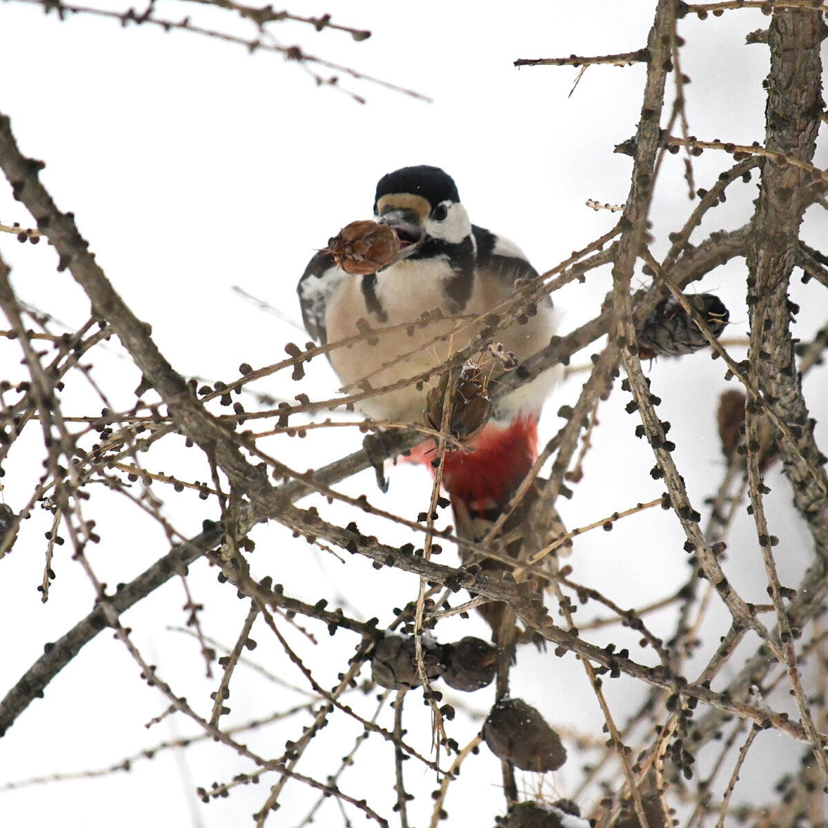 Вот до чего доводит любопытство. Или от дурной головы нет ногам покоя! Читайте мою сагу про дятла, как он завладел моим вниманием на несколько дней. А начиналось всё очень банально. Что может быть банальнее большого пёстрого дятла (бпд) - самого распространённого дятла из всех. 1 декабря отправилась в парк 300-летия Санкт-Петербурга в СПб. Наблюдала, как самец дятла срывает шишки с лиственницы. Дело это, как оказалось, не такое и простое. Одной лапой птица хватает шишку, другой держится за ветку, клювом дергает шишку. Клёст обычно в момент перекусывает веточку своим клювом-кусачками. Дятел так быстро не умеет, старается, трудится несколько минут. Это я узрела собственными глазами. Затем с шишкой взлетает на соседнюю лиственницу в кузницу. Иногда кузница оказывалась прямо на той-же лиственнице, где была сорвана шишка. В перерывах дятел летал подкрепиться на яблоню ягодную. Это я всё узрела за один день, неоднократно возвращаясь к лиственницам. Погода была морозная, валил снег, но дя