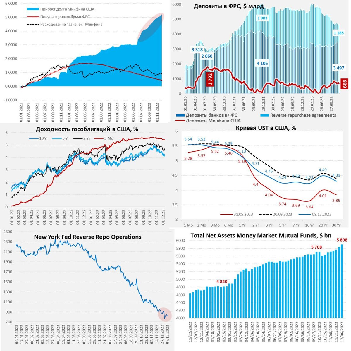 Что из этого следует. Последний отчет ФРС зафиксировал достаточно резкое сокращение активов ФРС сразу на $58.9 млрд, из них: портфеля гособлигаций на $30.4 млрд в рамках QT и объема кредитов на $26.5 млрд. По кредитам стоит сказать отдельно – здесь долг полностью ($33.9 млрд) вернула Корпорация по страхованию вкладов FDIC, чуть раньше получившая транш от Йеллен на $35 млрд. За весенний кризис все заплатил бюджет. Как я уже писал, банки нарастили займы у ФРС по программе BTFP на $7.8 млрд, пока это больше похоже на локальные проблемы с ликвидностью. Несмотря на сокращение активов ФРС, долларов в финсистеме к среде стало даже больше, т.к. $85.9 млрд со своих счетов в ФРС потратил Минфин США. По планам нужно будет вернуть баланс к $750 млрд на конец года, так что с этой стороны могут быть небольшое изъятие ликвидности к концу года. Еще $69.6 млрд пришло из обратного РЕПО ФРС, хотя это было чуть раньше – в прошлый четверг, после чего объем RRP, наоборот подрастал до $821 млрд. С 29 ноября