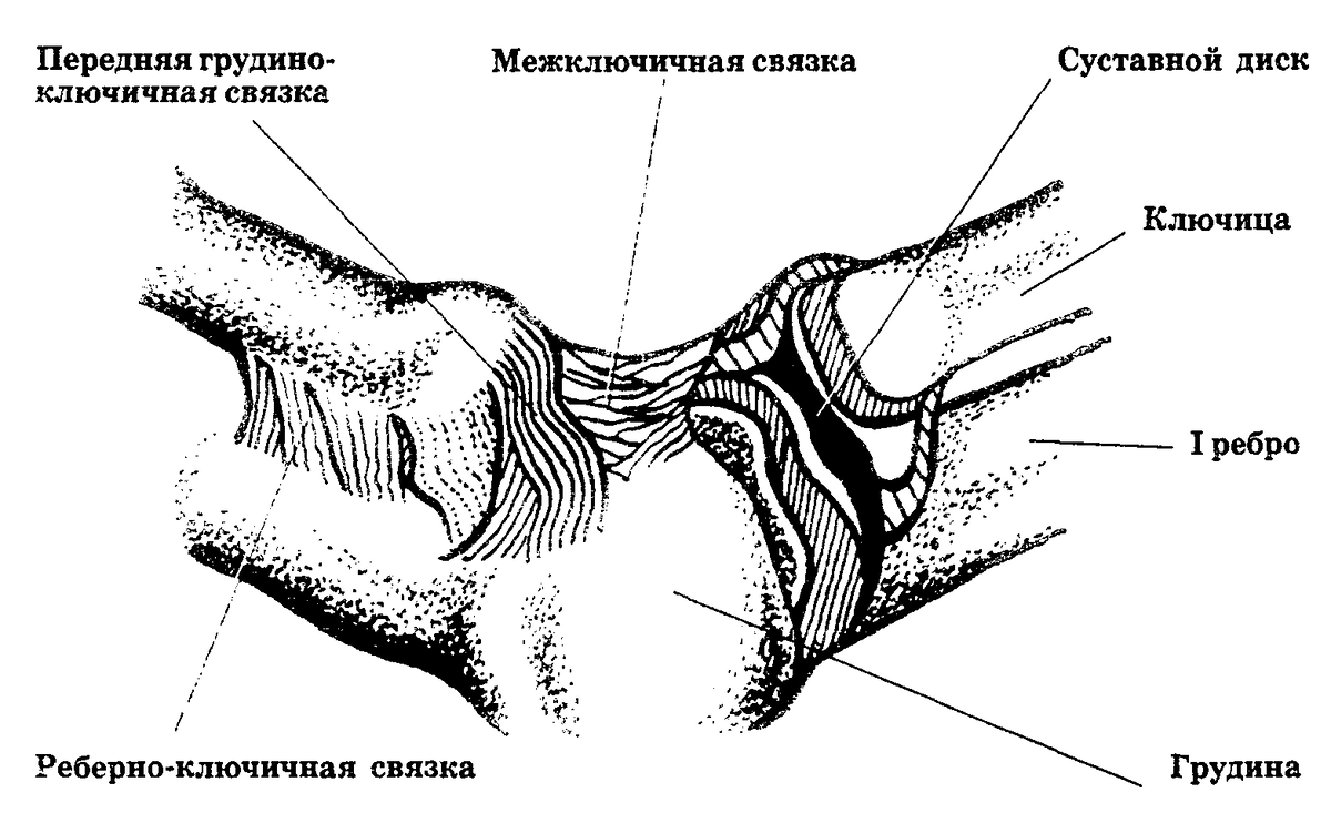 Если же представить себе, что ключица неподвижна, а двигается грудина, то смещение ее кверху и книзу в этом суставе будет идентично сопровождаться смещением кверху и книзу ключичной части.