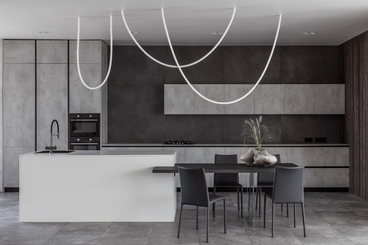 Архитектура и дизайн частного одноэтажного дома, расположенного в плотной застройке коттеджного поселка, отражают жизненные ценности и потребности молодой семьи, которая ценит комфорт и функциональность. Композиция дома состоит из двух пространственных блоков, зажатых между двумя пластами навеса и террасы. Технический блок композиционно выезжает из общего объема здания, как бы вырываясь из единой структуры. В зоне парковки автомобилей размещен массивный консольный навес, который продолжает архитектуру дома. Его уникальная особенность — сложное конструкционное решение, позволившее опереть навес на одну опору. Отделка фасадов комбинированная: штукатурка и натуральное дерево. Использование натурального дерева на фасаде и в интерьере придает дому ощущение тепла и уюта. Планировочное решение дома сформировано функциональными зонами: общая, приватная и техническая. В состав общих пространств входят: кухня-гостиная, гостевая комната и санузел. Из прихожей попадаем в просторную кухню-гостиную,