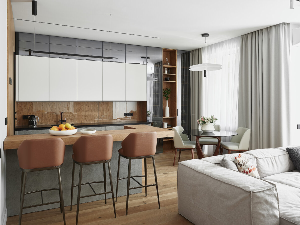 Переезд из загородного дома в квартиру – дело непростое. Дизайнер Алла Савина показывает, как в квартире при метраже 80 кв. м создать функциональное пространство для комфортной жизни. Заказчики переезжали из коттеджа в квартиру в центре города, поэтому самым главным их вопросом стало размещение всех вещей. Вторым и не менее важным требованием стал ремонт в кратчайшие сроки. «Заказчики этого проекта – люди порядка, им в первую очередь было важно создать в новом доме атмосферу чистого и опрятного интерьера, без лишних деталей и визуального шума. Поэтому мы решили остановить выбор на минимализме», – объясняет автор проекта, – я очень благодарна заказчикам, потому что от этапа визуализации мы быстро перешли к ремонту, все было четко и по срокам. Планировка рассчитана на проживание двух людей, поэтому ради создания отдельной спальни кухню было решено совместить с гостиной. Чтобы организовать в ней большую систему хранения с нишей под ТВ-зону, место между шкафами было углублено вну