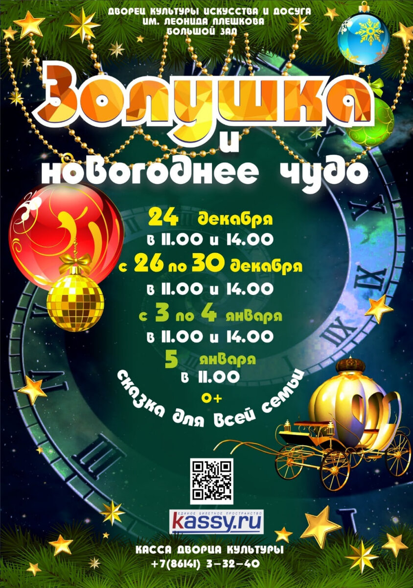 Во Дворце культуры с 24 декабря стартует серия праздников для юных геленджичан «Золушка и новогоднее чудо». Вместе с яркими персонажами любимого произведения - Золушкой, Мачехой, Феей, волшебным Зеркалом, дети смогут ощутить себя жителями сказочного королевства. Их ждут приключения и чудеса! Даты проведения: 24, 26-30 декабря, 3, 4 января в 11.00 и 14.00, 5 января в 11.00. Приобрести билеты можно в кассе учреждения. Подробнее по телефону: 8(86141) 3-32-40.