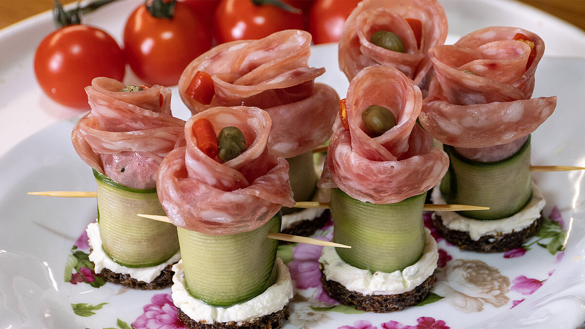 Приготовление: Тонкими ломтиками нарезаем хлеб и с помощью пекарского кольца вырезаем из мякиша небольшие кружочки. На сливочном масле обжариваем кружочки с двух сторон. Овощечисткой нарезаем огурец на длинные и тонкие слайсы. На огуречные слайсы выкладываем тонко нарезанную колбасу и сворачиваем всё в рулетик. Фиксируем всё зубочисткой. Обжаренные гренки смазываем творожным сыром, сверху ставим получившуюся "огуречную розочку", добавляем каперсы и колечки маринованного перца. Аппетитную закуску подаем на праздничный стол, наслаждаемся красотой и вкусом. Приятного всем аппетита!