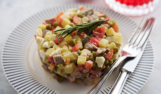 В честь наступающего года Зелёного Дракона подготовили специально для вас новые рецепты для праздничного стола. Раздраконили классические блюда и придумали на их основе новые - вкусные, яркие, ничуть не хуже оригиналов! Оливье с бужениной из индейки Оливье с домашней бужениной из индейки и хрустящим сладким перцем - новая оригинальная версия самого популярного новогоднего салата! Филе бедра индейки, предварительно замоченное в солёной воде, получается при запекании очень мягким и нежным и идеально подходит в качестве мясного компонента для этого салата. Посмотреть рецепт с пошаговыми фотографиями и заказать все ингредиенты. Селёдка на шубе Переверните привычную классику с ног на голову: уложите нежную слабосолёную сельдь не под шубу, а на шубу из варёных овощей и яиц, заправленных майонезом, и подавайте любимый салат порционно - в тарталетках. Посмотреть рецепт с пошаговыми фотографиями и заказать все ингредиенты. Мимоза с двумя видами красной рыбы Приготовьте в этот Новый год мимозу