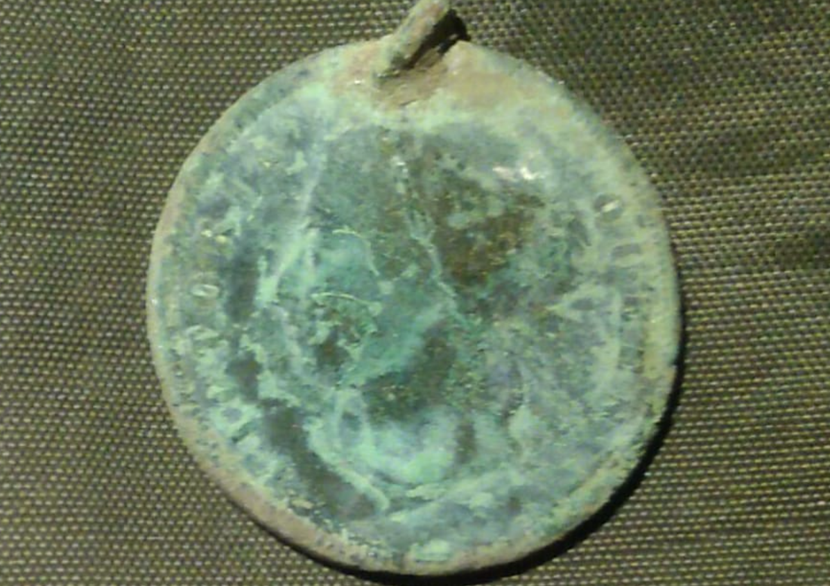 Очередной имперский какалик? Не похоже. Патина странная. Зелень, да, но чисто внешне совсем другая. Не рыхлая, заметно более плотная. Диаметр отличается от стандартных монет, визуально больше трёх копеек, но меньше пяти. Толщина, опять же, больше последнего чекана. И, главное, самодельное колечко, вставленное через проделанное отверстие.