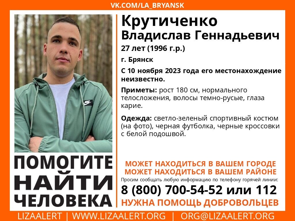 Брянский поисковый отряд «Лиза Алерт» распространил ориентировки на 27-летнего жителя областного центра Владислава Крутиченко. Добровольцы и сотрудники полиции разыскивают мужчину, местонахождение которого неизвестно с 10 ноября. Прошел уже месяц, но он так и не объявился. Его приметы: тёмно-русые волосы и карие глаза. Мужчина нормального телосложения ростом 180 сантиметров был одет в светло-зелёный спортивный костюм, чёрную футболку и чёрные кроссовки с белой подошвой. Всех, кто располагает сведениями о пропавшем, просят звонить по телефонам 8 (800) 700-54-52 (Горячая линия ЛА) или 02, 102 (полиция). В Брянске ищут пропавшего без вести месяц назад 27-летнего Владислава Крутиченко