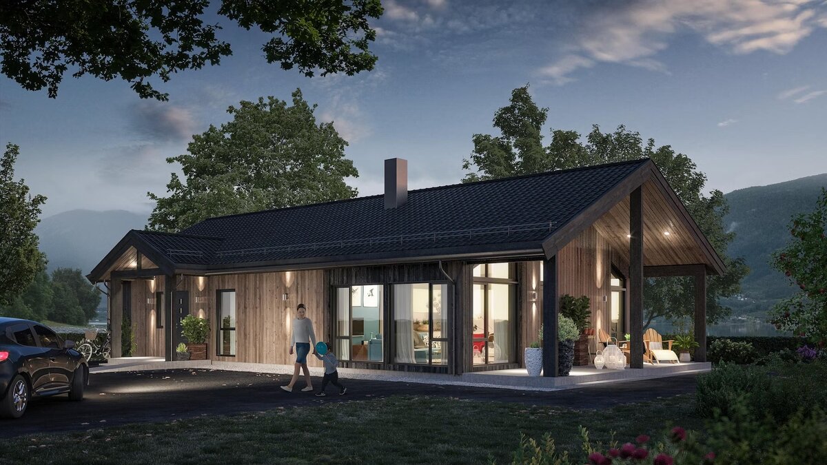 Добро пожаловать в современный одноэтажный дом, площадью 114м2 При входе вас приветствует просторная прихожая, где достаточно места для размещения шкафов. Из прихожей спроектирован прямой вход в домашнюю прачечную - практичное решение в повседневной жизни. В доме есть прекрасная жилая зона с открытой кухней и гостиной, площадью около 45 квадратных метров. Внутри эти помещения очень светлые и просторные, с большими окнами от пола до потолка.