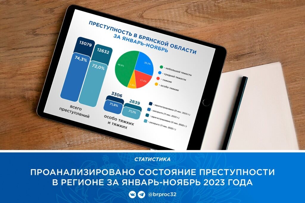 Прокуратура Брянской области проанализировала состояние преступности за январь-ноябрь. Зарегистрировано 13079 преступлений, что на 3,5 процента выше, чем в аналогичном периоде 2022-го, сообщает пресс-служба надзорного ведомства региона. Количество тяжких и особо тяжких посягательств увеличилось на 16,4% и составило 3306. Основную долю зарегистрированных преступлений составляют преступления небольшой тяжести — 48,6%, средней — 26,2%. Выявлено 952 злодеяния в сфере незаконного оборота наркотиков (+1,6%). Хищения чужого имущества составляют 51% от всех зарегистрированных преступлений, из них совершено путем кражи – 2840, грабежа –219, разбоя – 15. Общая раскрываемость преступлений увеличилась на 2,3% и составила 74,3%. На улицах произошло 1721 преступление (-4,9%, АППГ – 1809). Число лиц, совершивших преступления, составило 6368, из них 1205 женщины. В Брянской области увеличилась преступность