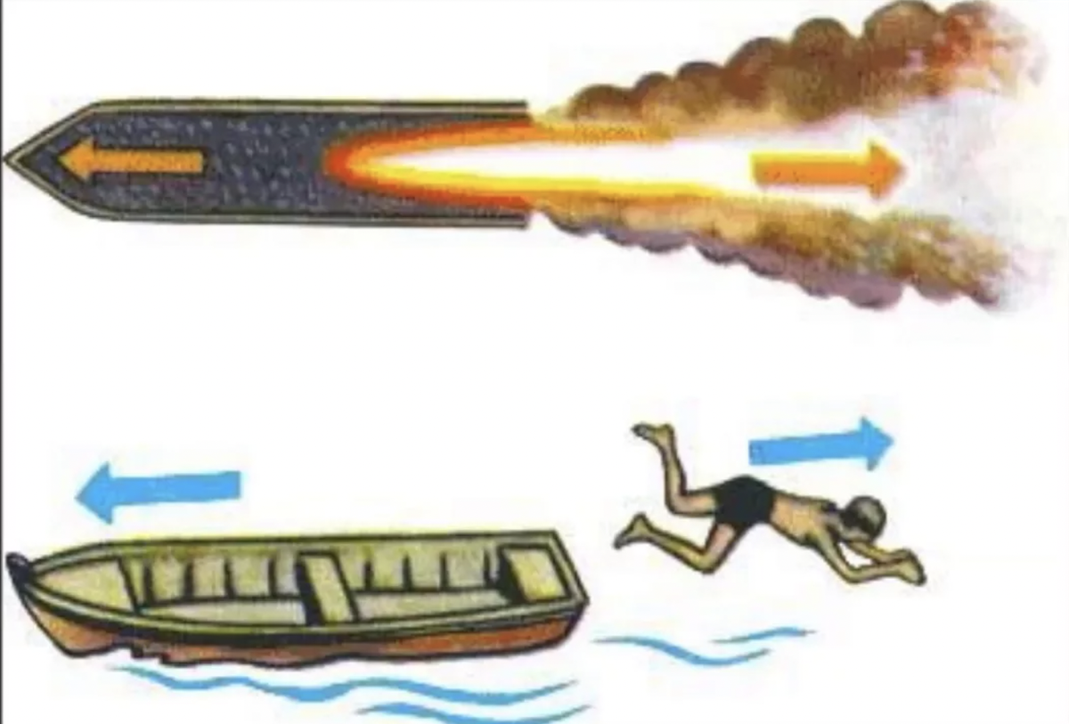 То есть ракета летит вперед по той же самой причине, по которой вперед продвинется лодка из-за прыгающего с ее борта человека.