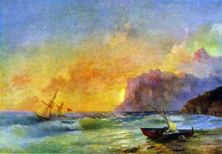 Эта картина была написана Иваном Константиновичем Айвазовским в 1817 году. На переднем плане я вижу небольшой пляж, на который набегают пенные волны. На пляже лежит рыбацкая лодка, устремленная носом в сторону волнующегося моря. Видно, что волны сильно ее потрепали. Парус весь сбился в бесформенный куль. Лодка бортом уткнулась в большой камень. Создается впечатление, что бурные мутные волны вот-вот подхватят ее и вновь унесут в морские дальние дали, за линию горизонта, которая отчетливо видна на фоне грозовых туч, расцвеченных заходящим солнцем в огненные краски. Создается очень правдоподобное впечатление, будто за линией горизонта бушует огромный пожар. Тучи на переднем плане выглядят, словно клубы густого дыма. Глядя на эту картину, меня охватывает ощущение тревожного предчувствия надвигающейся бури, от которой не будет спасения ни на море, ни на берегу. И только яркий солнечный свет, как луч надежды, пробивается через непогоду. Данная картина отражает любовь художника к природе, к м