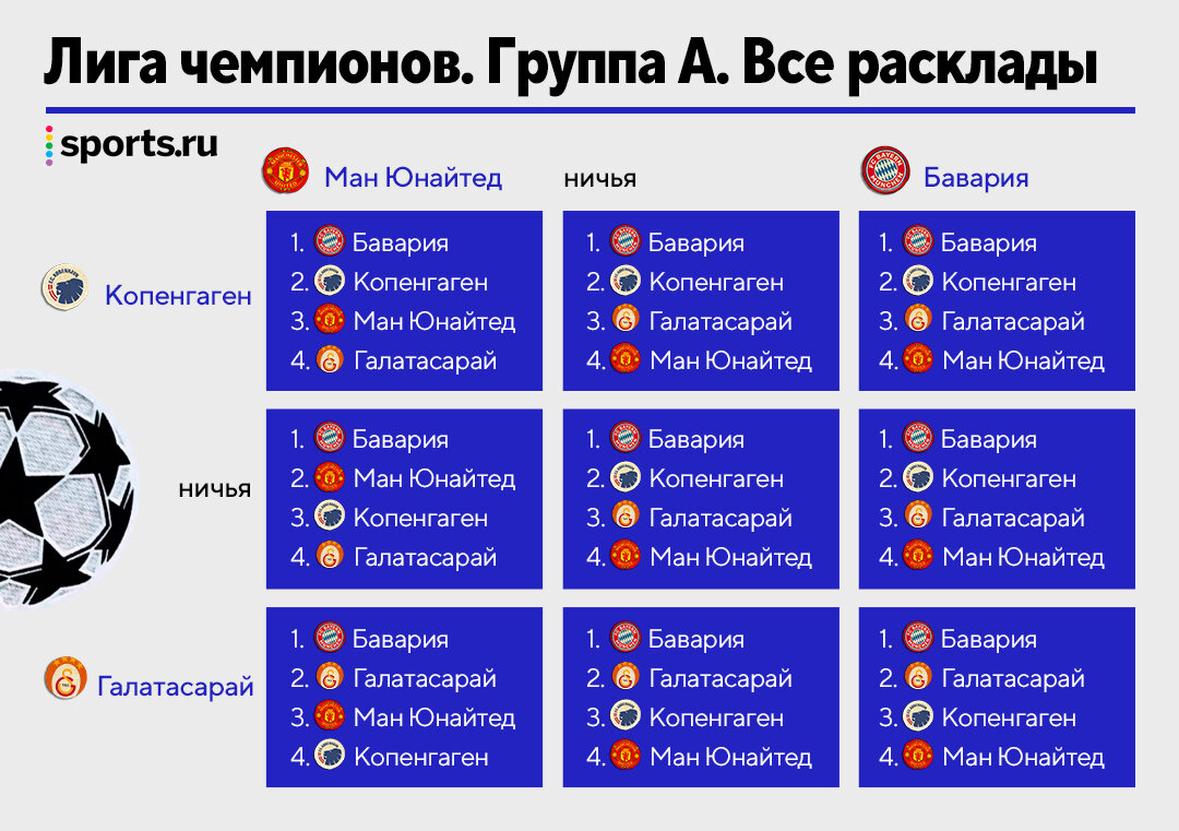Главные интриги последнего тура группового этапа ЛЧ – тут. На четыре оставшихся путевки в плей-офф претендуют десять клубов, а среди вылетевших могут быть «ПСЖ» и «Манчестер Юнайтед». У «МЮ» ситуация особенно страшная. Для «МЮ» сойтись должно многое. Даже в ЛЕ попасть непросто Смотрим расклады. «Бавария» точно выходит с первого места – но мотивации против «МЮ» может добавить кошмарный разгром от «Айнтрахта». «МЮ» выйдет в плей-офф, если: ● сам выиграет у «Баварии» (матч дома). ● «Копенгаген» и «Галатасарай» параллельно сыграют вничью. Победа одного из конкурентов – что датской, что турецкой команды – оставит «Юнайтед» шансы максимум на Лигу Европы. Чтобы рассчитывать хотя бы третье место, придется набирать очки с «Баварией». При собственной ничьей «МЮ» займет третье место, если «Копенгаген» победит в один мяч и не забьет при этом на пять мячей больше «Юнайтед» – тогда английский клуб будет выше за счет большего количества голов при равной разнице. «Копенгаген» выйдет в плей-офф, если о