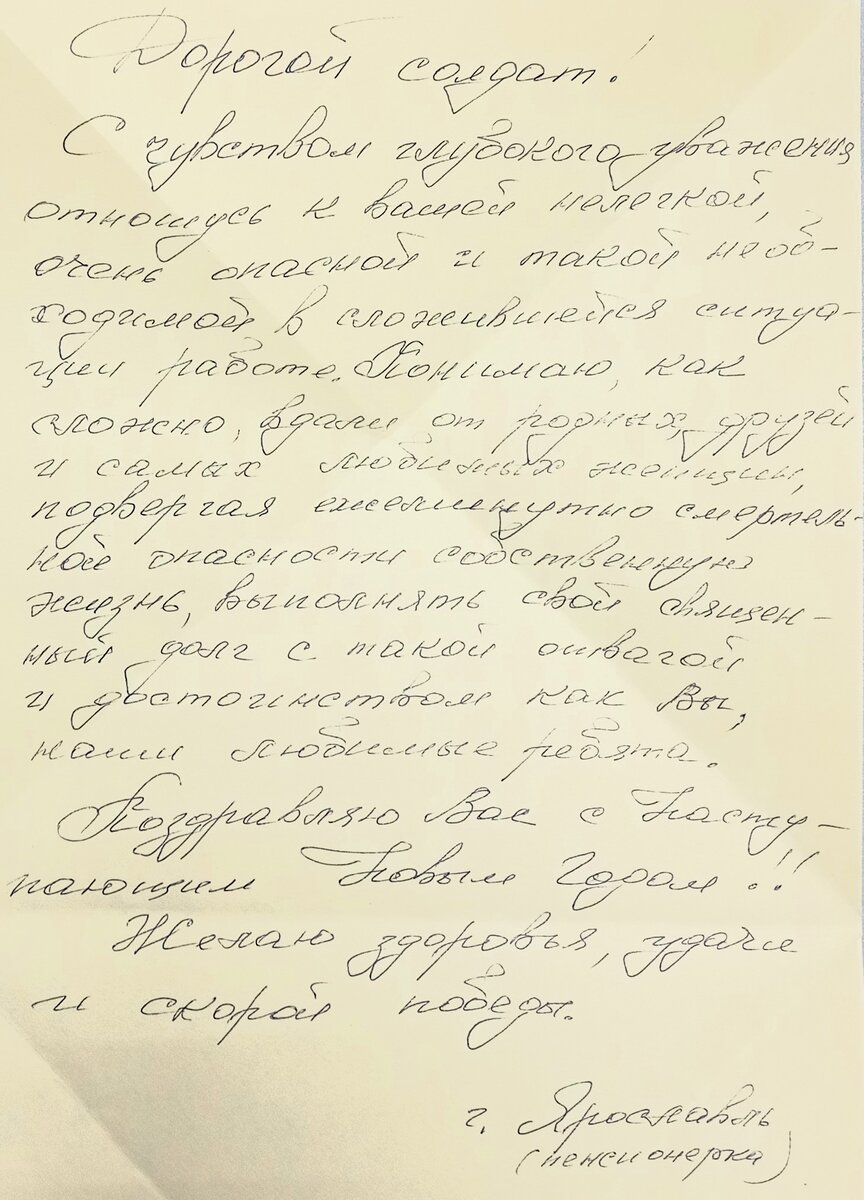 Многие получатели социальных услуг проявили желание поддержать бойцов теплыми словами и написали письма поддержки. Центр продолжает сбор, все желающие могут помочь и принести теплые вещи (носки, варежки, балаклавы), нескоропортящиеся продукты по адресам: пр-д Матросова д.10 б, ул. Индустриальная д. 35, ул. Калинина д.1/165.