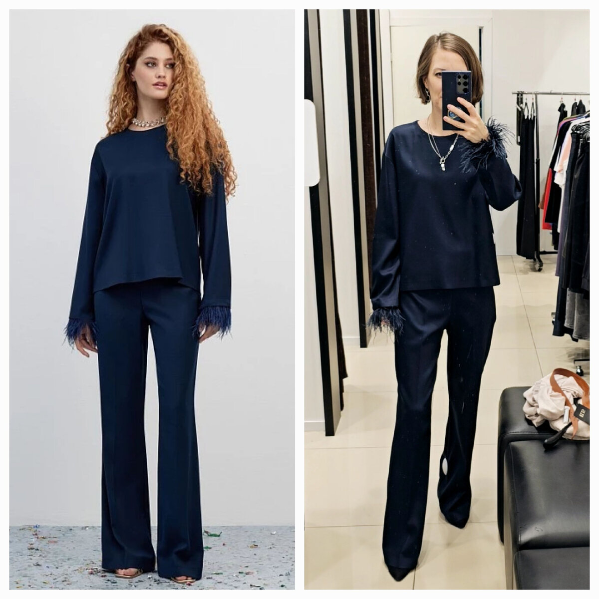 В Элис новогодняя коллекция не очень большая, но в ней много отличных вещей, причем не одноразовых - их можно будет носить и после праздников, что очень выгодно. Есть, конечно, и неудачные вещи. Я вам сегодня покажу и те, и другие на себе и на моделях в каталоге бренда. Костюм из вискозы: блузка с перьями + брюки-клёш Очень удачный костюм, который подходит и для праздничного образа, и более чем уместен в повседневной жизни. Перья на блузе отстегиваются - получится базовый лонгслив. Сшит костюм из плотной вискозы, которая удачной выделки - практически не мнется. Блуза чуть оверсайз - 42 размер на мне выглядит отлично, а вот брюки того же размера (42 - самый маленький у производителя) чуть великоваты. Брюки без пояса, поэтому важно, чтоб они идеально сели. Цена каждой вещи - 8 999 ₽ Брюки из экокожи золотистые, джемпер фактурной вязки Здесь визуально обе вещи отличные и вместе здорово и празднично выглядят. Без ложной скромности скажу, что джемпер на мне сидит лучше - на модели е