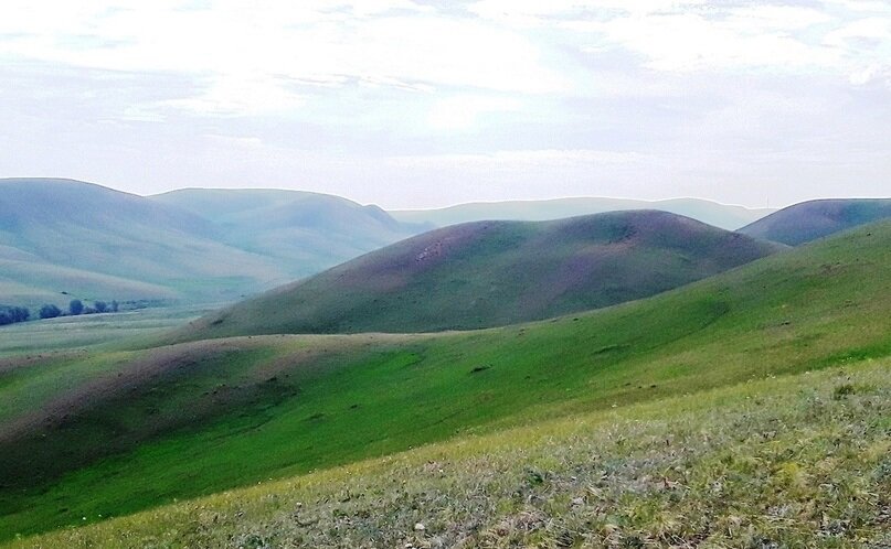 Много земляники, трав и цветов. Ветер не сильный и теплый. Изначально планировал пройти весь маршрут, вплоть до трассы. Но из-за расписания электричек пришлось сократить путь. В итоге дошел до Малого Косымского ущелья и повернул обратно. Урочище "Кызымка" от тюрк. означает"девушка". Очень красивое название. И понятно почему - местность очень красивая, широкие просторы, изучай да покоряй! Склоны покрыты ровным травяным ковром, деревья можно встретить лишь в низинах. Плавно перетекающий рельеф напоминает застывшие волны. На фоне степи Долгие горы кажутся громадными. Если инопланетяне в древности и прилетали на нашу планету, то спрятать свой корабль они могли как раз именно здесь, замаскировав под одну из выпуклостей.