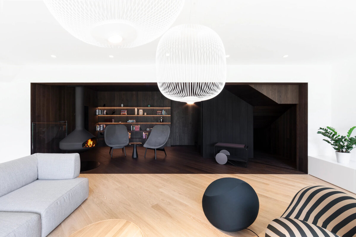 Дизайн интерьера виллы с тренажерным залом на 4-м этаже и прекрасными видами. В жилом районе Праги архитекторы Роман Вртишка, Владимир Жак и Люция Немцова разработали интерьеры четырехэтажного дома-виллы. Заказчики хотели создать индивидуальное жилое пространство для супружеской пары профессиональных спортсменов, которое бы дополнило существующее здание. Уникальной особенностью является, в частности, расположение тренажерного зала на последнем этаже здания с впечатляющим видом на Прагу. Концепция виллы выдержана в светлых и темных тонах, всегда в соответствии с важностью и функцией помещения или пространства. Авторы старались работать с потенциалом психологии цветов. Светлый цвет используется преимущественно в дневных/активных зонах, а темный способствует расслаблению и успокоению. "Выбирая ручки для всего дома, мы явно выбрали мимикрию - нам нужны были ручки, которые бы естественно сливались с поверхностью двери. Фурнитура MINIMAL с розеткой, не выходящей за контур самой ручки, бла