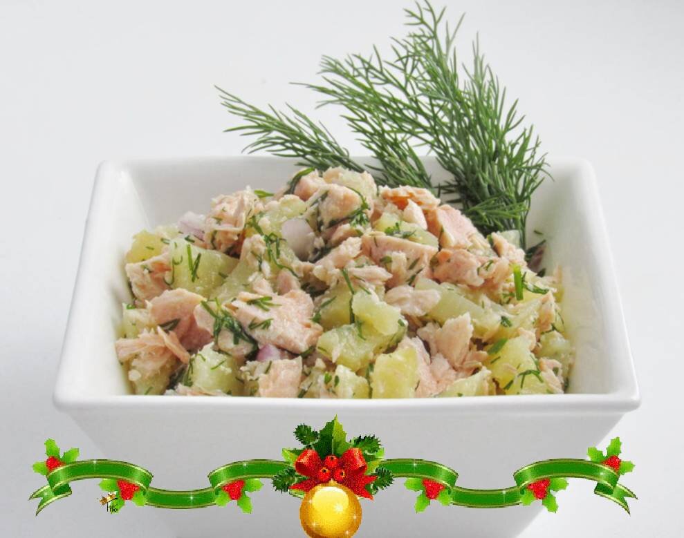 Новый год, Рождество, Старый Новый год. Много и долго. А ведь можно отдыхать, наслаждаться едой и при этом не наносить ущерб здоровью. Нам потребуется: рыба красная свежемороженая (в моем случае горбуша), картофель отварной, лук красивее красный, зелень по вкусу, масло растительное. Приблизительно беру все в равных частях. Горбушу отварить и руками разделать на кусочки. Картофель отварить порезать кубиками или произвольно. Лук нарезаем кубиками. Зелень рубим. Все смешиваем. Немного масла. Получается необыкновенно вкусно. ВНИМАНИЕ!!! Картофель можно заменить рисом, 1 ст.л. Масло - майонезом.