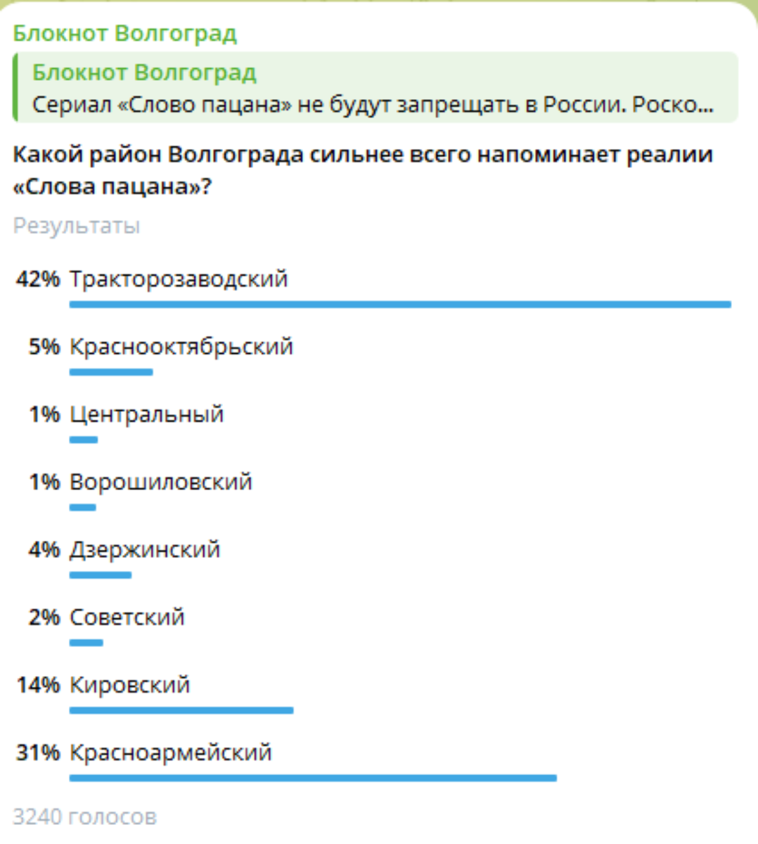 Уютный центр и Ворошиловский район с антуражной застройкой волгоградцы сразу вычеркнули из мест, которые напоминают реалии «Слово пацана». За них голоса отдали по 1%. Советский (2%) и Дзержинский (4%) районы тоже оказались неподходящими. Вероятно, это из-за большого количество новостроек и современных ЖК — это слабо вяжется с образом СССР.