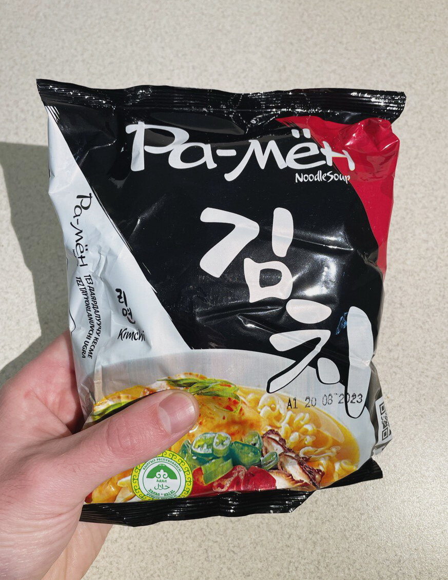 Привет. Прошло два месяца с предыдущего обзора и сегодня я готов продолжить дегустацию. На сегодня у нас Ра-мён Noodle Soup с кимчи. Производят эту лапшу в Бишкеке, Республика Кыргызстан. Куплена в Минске за 2BYN или 0.65$. На упаковке заявлено 120 грамм, это хорошая порция лапши, которая может стать полноценным обедом. К моему сожалению эту лапшу необходимо варить, а не заливать кипятком и ждать. С одной стороны, это усложняет процесс приготовления, с другой стороны это абсолютно другой уровень лапши, она на порядок лучше. Достав кастрюльку я залил лапшу 0,5 л. воды +-, высыпал приправки и варил 4-5 минут. На упаковке по рецепту предлагается дополнить блюдо ломтиком сыра, колбаской и вареным яйцом. Я иногда добавляю половинку вареного яйца, но не в этот раз. Лапша получилась на уровень выше тех, что нужно просто заливать кипятком. Насыщенный аромат и вкус от специй не оставили меня равнодушным к ней, ее сложно сравнивать с предыдущими, она определенно лучше вкуснее и возможно немножеч
