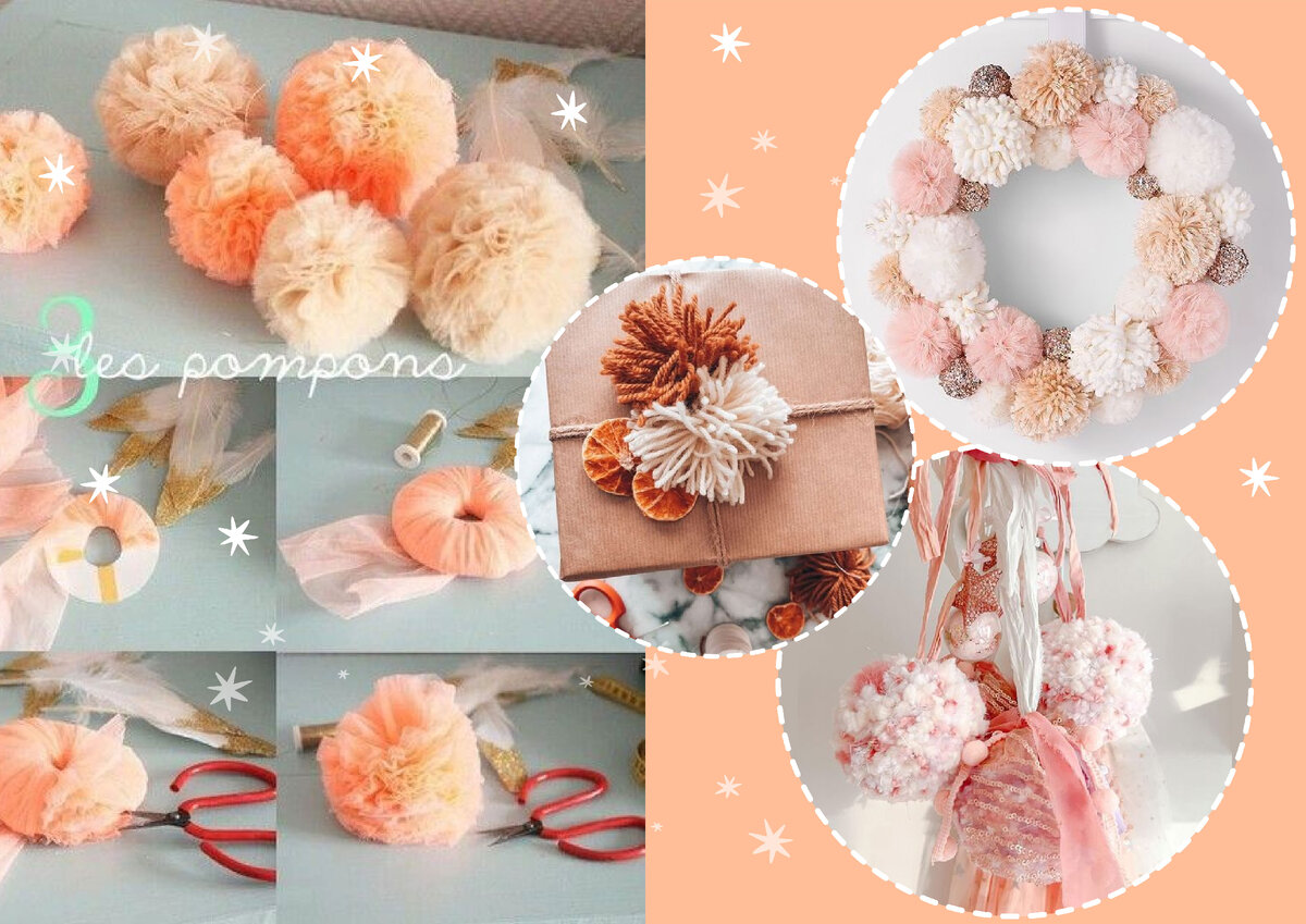 Цвет 2024 Peach Fuzz - символ заботы друг о друге. А как известно: как Новый год встретишь, так его и проведёшь. Поэтому всем рекомендую использовать этот цвет в домашнем новогоднем декоре. Тем более, Персиковый пушок легко повторить и создать своими руками. Например, нежные пушистые пампушки: Такие пампушки нежно-оранжевого цвета используйте для декора интерьера и подарков. Самый простой вариант оформить праздничный интерьер в цвете 2024 года - это взять персиковые нитки или ленточки, связать из них бантики и прикрепить их на ёлочные игрушки. Игрушки ручной работы (шитьё, вышивка, макраме) в бежево-оранжевой гамме превосходно будут создавать не только праздничное настроение, но и домашний уют. Мастерицы всегда в топе!!! Настольные Ёлочки цвета Персикового пушка выглядят очень воздушными и невесомыми. На коллаже представлены ёлочки, созданные рукодельницами в самых разнообразных техниках. Творите также и создавайте свои шедевры! Рождественские носки тоже можно сшить, используя отте
