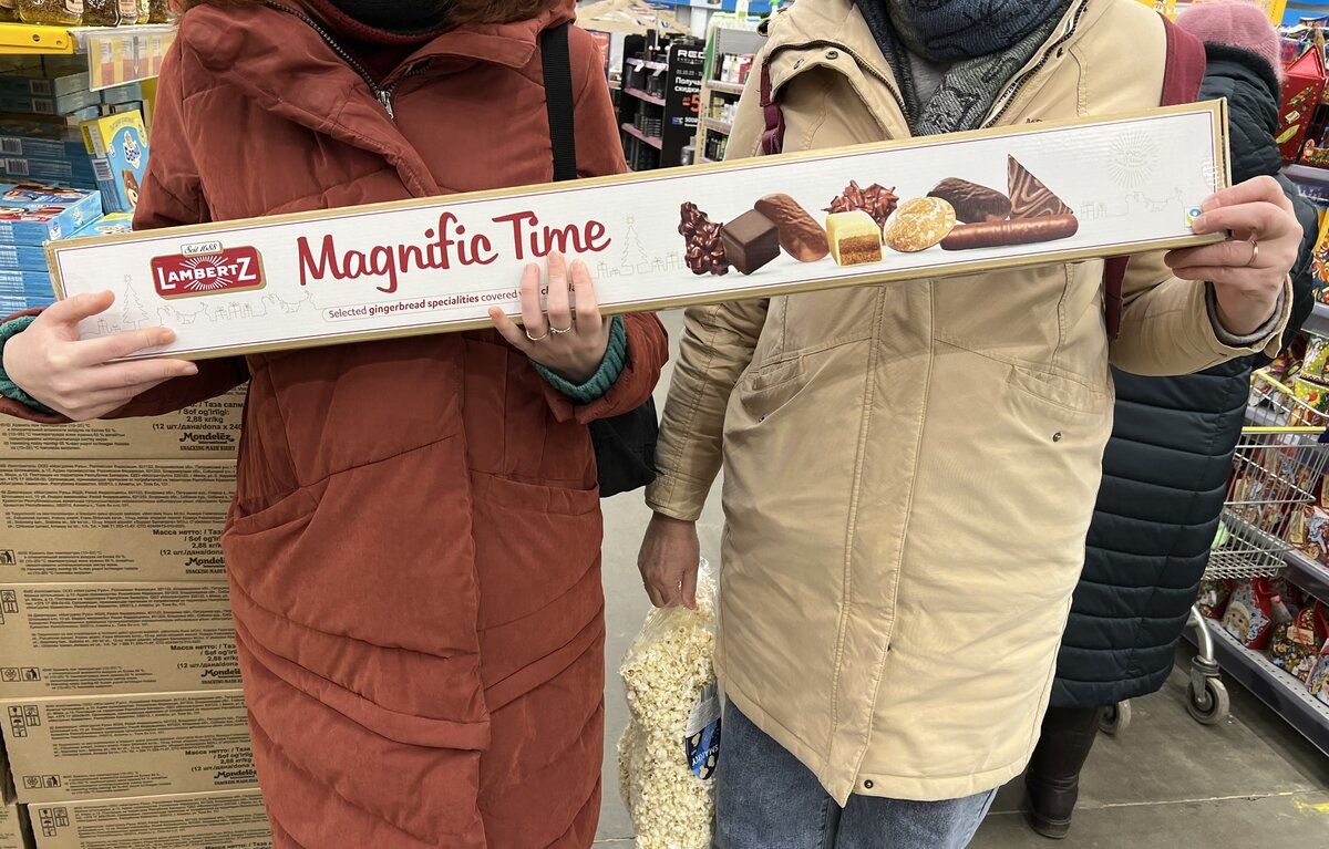 Кто сказал, что сладкие подарки любят только дети? Не помню, до какого возраста раньше были положены подарки ребятишкам тех работников, кто состоял в профсоюзах. До 10? 14? 16 лет? Помню только, что когда я уже вроде бы выросла, все равно ждала мешочек от Деда Мороза! И батя приносил подарки не только нашим младшим, но обязательно и мне тоже! Хотя мне уже не давали бесплатный - доплачивал, чтобы никому не было обидно. Чего это я в ностальгию ударилась? Да, потому, что подарки тогда были в разы вкуснее тех, что продают в ярких коробках сейчас! Сколько раз уже я зарекалась покупать эти новомодные подарки - конфеты, что замазка для окон - не вкусные! А тут гуляли по "Ленте", и я, смотрите, что углядела! Сначала покажу такой подарок, который не стыдно и взрослому вручить - коллеге по работе, учителю. Да, даже и шефу! Почти 2 метра чистой радости получается:) Стоит такая упаковка 999 рублей за 800 граммов. Внутри - мягкие пряники в глазури. Эти коробки - немецкие. Есть вариант поменьше и