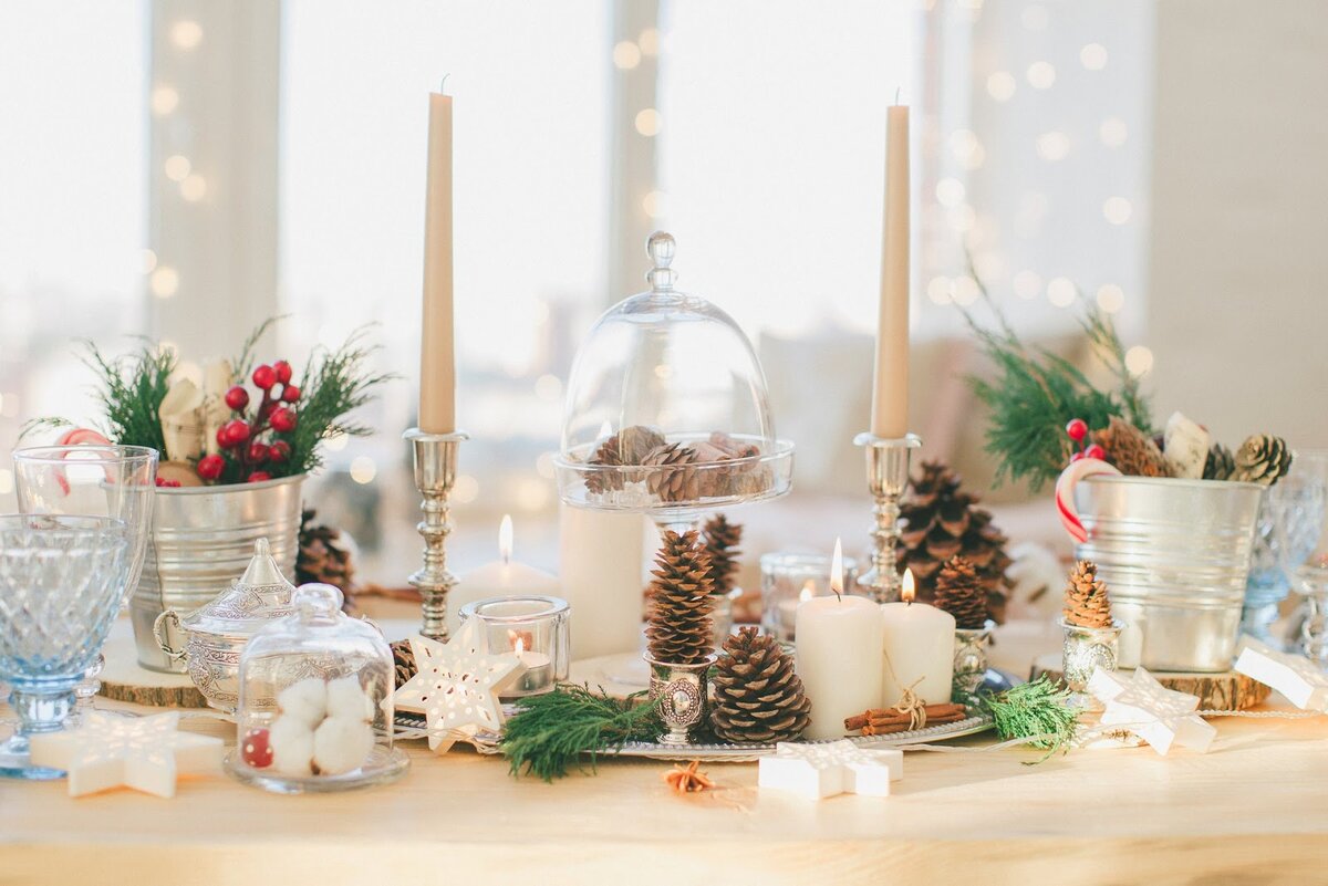 Фотограф: Анна Соколова Украшение на подносе Прием заранее продуманный. Пока праздничная утка запекается в духовке, а закуски ждут своего часа, стол уже может радовать праздничной декорацией. Новогоднюю сервировку заранее оформляем в центре стола на подносе, чтобы убрать украшение перед подачей горячих блюд. Ярусный декор Многоуровневое декорирование поможет избежать плоской сервировки. Обратите внимание на фото: стол выглядит объемным. Разберем каждый уровень. Нижний ярус — шишка на древесном спиле и цилиндрические свечи разной высоты. Средний ярус — ассамбляж из шишек, ягод и еловых веток в ведерках. Верхний ярус — высокие свечи и фрукты в креманке на длинной ножке. Если оформить декор только на одном уровне, укр