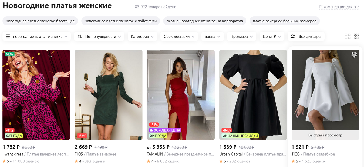 Приближение Нового года - это не только время волшебства и ожидания чудес, но и отличный повод обновить гардероб, выбрав яркое платье для праздничного вечера. Интернет-магазин Wildberries предлагает широкий ассортимент нарядов для любого вкуса и бюджета. В преддверии новогодних праздников многие женщины стремятся найти идеальное платье, которое подчеркнёт их индивидуальность и создаст неповторимый образ. Сейчас в магазине действуют большие скидки и акции. Много моделей можно купить по цене в два раза дешевле. А на нашем сайте представлены самые лучшие и выгодные предложения от всех магазинов. Женские новогодние платья Женские новогодние платья на Wildberries представляют собой восхитительное разнообразие фасонов и стилей, отвечающих последним модным тенденциям. Здесь каждая женщина найдет идеальный наряд для встречи Нового года, будь то шикарное вечернее платье с блестками или элегантное коктейльное платье. Ассортимент включает модели различных длин и кроев: Палитра цветов варьирует