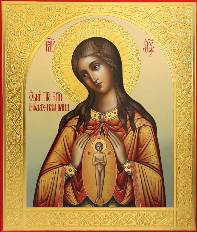 Одеяние Богородицы написано с золотым отливом и красноватыми тонами складок и отделки.