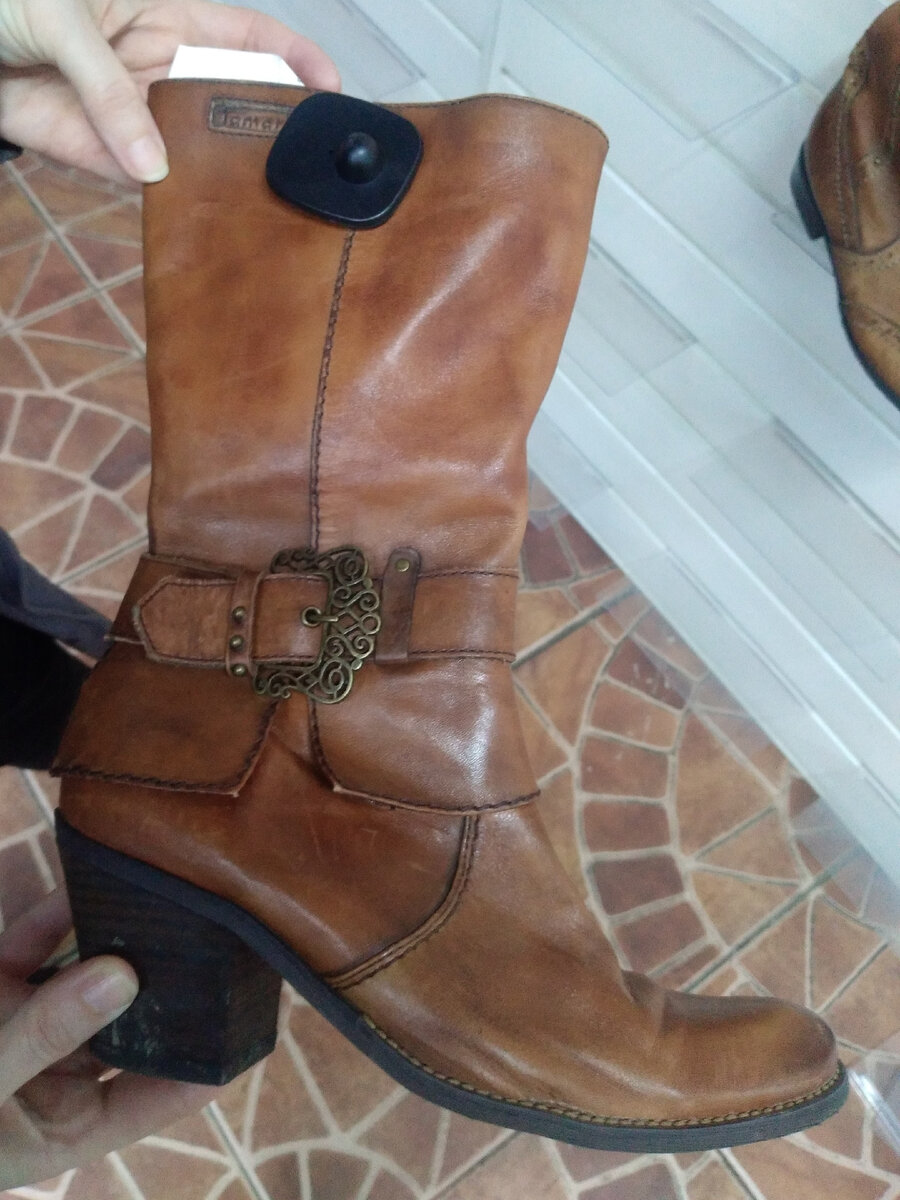 Здравствуйте. Сегодня я покажу обувь, всё можно было купить со скидкой 60%. Демисезонные сапоги из натуральной кожи, высокий, но устойчивый каблук. Очень необычные, так сказать под старину, когда на ботиночек надевали гамаши)). И пряжка на ремне такая кружевная и изящная. Ношеная, но изнутри, снаружи в отличном состоянии. Находка для любителя неординарной обуви. Цена соответствующая. Тоже демисезонные сапоги, каблук поменьше, сантиметра в три. Тоже с пряжкой, но маленькой и красивой перфорацией с заклепками. Или новые или очень мало носили. BONITA – это немецкий бренд, основанный в 1971 году в городе Дармштадт. Производитель мужской и женской одежды из натуральных тканей, аксессуары, часы и ювелирные изделия, изделия из кожи и сумки. Чёрные ботинки, новые. Взяла бы, но 37 размер( Лоферы светлого кремового цвета, толстая тракторная подошва. Похожи на новые. Название модели пришло в русский язык из английского — loafer означает «бездельник», что уже само по себе намекает: эта обувь для т