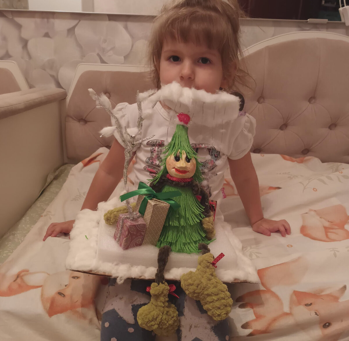 Добрый вечер, уважаемые читатели! На этих выходных мы с дочкой трудились над новогодней поделкой. Работа у нас совместная. Даже Алёнка поучаствовала. Конечно, кое-что делала только я, но у нас в детском саду не проводятся конкурсы работ и не сравниваются детские и взрослые работы. Просто выставляются на стол в общем коридоре, и все ими любуются. Или дети, проходя мимо выставки радостно кричат, узнавал свое творчество, что: "это моё". Вот и у нас родилась такая чудо-ёлочка. Хотя изначально планировался снеговик. Но тут уж как говорится, фантазия незнает границ и снеговик превратился в ёлку. А почему бы и нет. Ведь тема: "Новогодние чудеса". Конус склеен из обычной картонки, внутри набит обрезками бумаги и газетой. Мордочка слепленна из полимерной глины и раскрашена. Да, мы с детьми пробуем не только пластилин. Лепим много из чего. Любим из солёного теста, например. Даже барельеф пробовали заливать. Мордашку приклеили на суперклей. Хвоя у нас из гофрированной бумаги. Посажена она на п