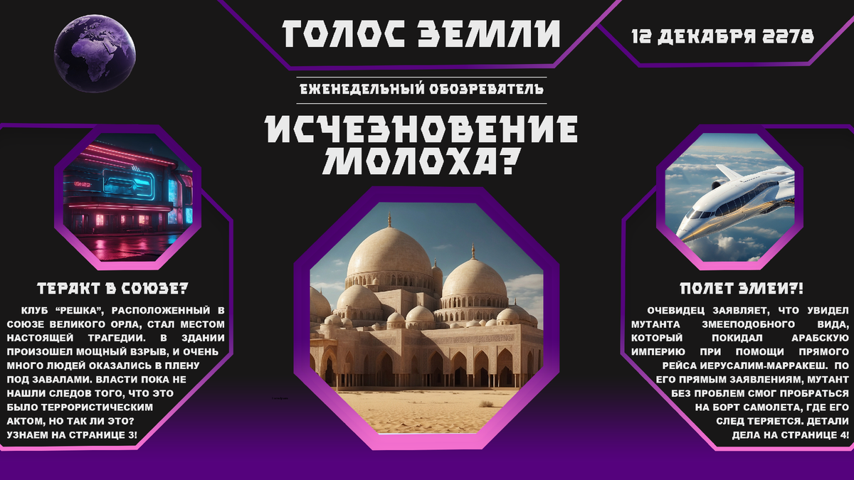 Все, что будет сказано ниже, относится к вымышленному миру ролевой игры Сумрак2096 и все совпадения с реальным миом являются случайностью. Более того, большинство описанных событий - это результат действий и принятых решений со стороны игроков, которые своими поступками меняют этот многогранный мир. Данная серия может быть не очень понятна, если вы новичок на этом канале. Рекомендую вам сперва ознакомиться с другими подборками (одна из них будет в конце статьи). Ну а теперь, приятного прочтения! Предыдущие посты серии вы можете прочитать в следующей подборке: Уважаемые читатели, последние новости несколько переполошили нашу редакцию. Нам пришлось экстренно собираться в Марракеш. Именно это является причиной задержки третьего выпуска. Погоня за очередной сенсацией пока не увенчалось успехом, но мы будем держать вас в курсе событий! На сегодня все! Но если вы хотите узнать еще что-то интересное, то наша редакция рекомендует следующие материалы: И не забудьте подписаться и поставить лайк,