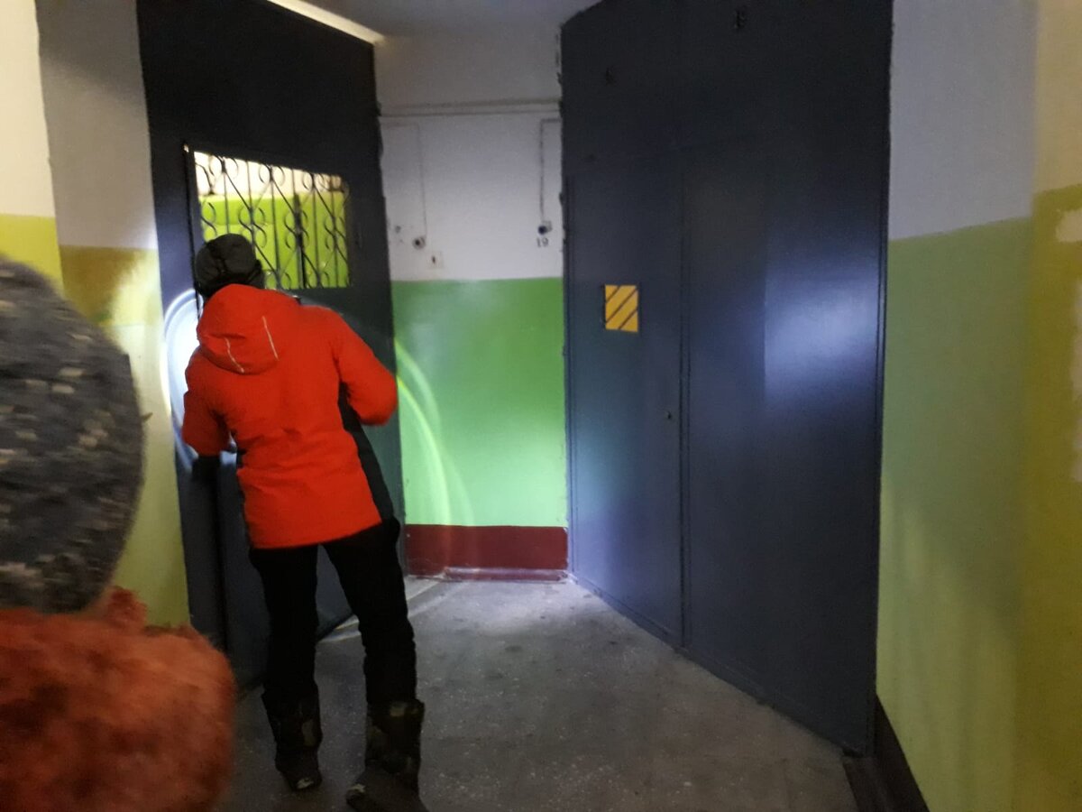 Заходим в подъезд, поднимаемся на лифте на последний этаж. Потом спускаемся по лестнице, по пути обыскивая каждую площадку. Фонариками просвечиваем недоступные места.